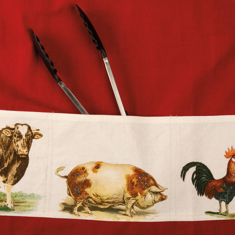 A cotton apron from the Farmhouse Collection featuring an embroidered "A Cow, A Pig And A Chicken Walk Into A BBQ . . . The End" sentiment and three front pockets featuring vintage-style farm animal designs.