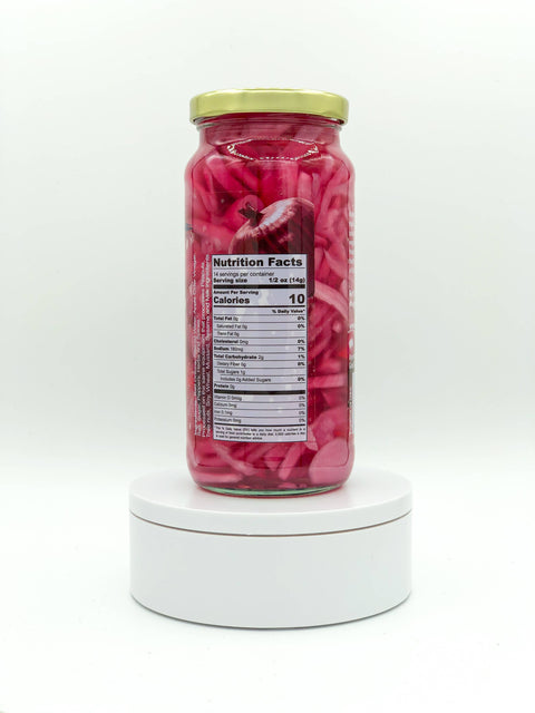 Artisanal hand-packed, small-batch pickled red onions with spicy red Thai chilies. A key ingredient in this delicate pickle is the apple cider vinegar. The all-natural pickling process preserves the red onion's natural vibrant taste. No artificial flavors, colors, or preservatives are used, letting the simple yet delicious flavors shine through in every jar.